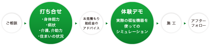 なかでもご利用者様にご好評を頂いているのが「体験デモ」。実際の福祉機器を使用して、リフォーム後の暮らしのシミュレーションが行えますので、その中でリフォーム内容の微調整を行いながら、より使いやすく暮らしやすいケアリフォームプランを作ることが可能です。