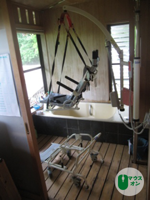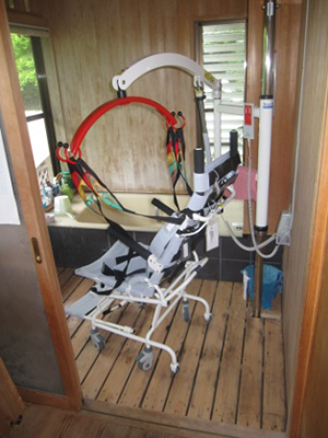 まずスノコで脱衣所と浴室の段差を解消し、「介護用リフトつるべーF2R」と「安楽キャリー分離タイプ」を合わせて導入されました。寝室からシャワーキャリーに乗って洗い場に向かい、身体を洗った後、介護用リフトを利用して、切り離した座面に座ったまま介助者が抱えることなく入浴することができます。