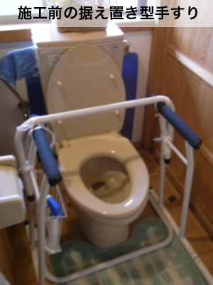 従来使用されていた据え置き型の手すりは、身体を支えるには弱く転倒の危険がありました。「ハートリーフレスト」と「やわらか補高便座」を組み合わせ、トイレをリフォーム。排泄時に適した前かがみの状態を作ることで、姿勢を安定させることができます。