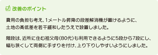 高台に家があるため、階段(高低差1.3メートル/5段上がり)を本人を抱えて上り下りする必要がありました。さらに駐車場まで30メートルの坂道になっており、車いすに乗せて移動もできますが、そのまま抱えて行くことも多くありました。