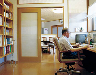 車いすでの生活でも快適な「終の住処」との希望を実現できるよう打ち合わせを重ねました。読書やパソコンがお好きで書斎にいる時間が長いということで、その席から外を眺め、四季を感じられたり、一日の太陽の動きがわかるようなプランとしました。