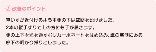 改築後、積極的に活動(リハビリ)ができ、また、室内の温度差がない住まいの効果もあるのか健康状態が良くなりました。