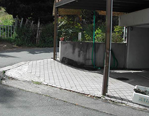 木造3階建て、玄関前階段を降りて約18m坂道を歩いたところにガレージがありますが、ガレージ前のタイルもスロープ状に貼ってあり、滑りやすく危険でした。