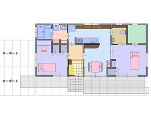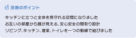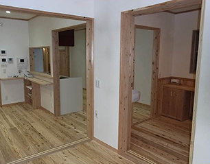 全面リフォームして本当に良かったと思います。水まわり、特にトイレは広く、2ヶ所の出入口のおかげでとても使いやすくなりました。雨の日も駐車場から濡れずに、玄関だけでなく寝室にも直接入れるのが嬉しいです。