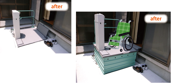 段差解消機を設置して、車いすのまま直接で入りができるようにしました。