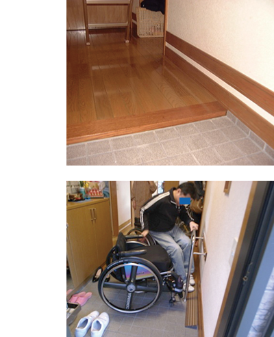 屋外用の車いすで室内に乗り入れることがないご利用者さま。ほこりが上がらないよう、上がりかまちをあえてフラットにせず、わずかな段差を設置しました。