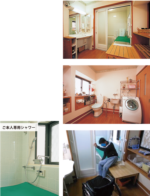 脱衣室移乗台から、かさ上げした洗い場へ、ご本人の力で移動することができます。かさ上げした洗い場にはご本人専用のシャワーがあるので、介助を前提とせずに入浴をすることができます。