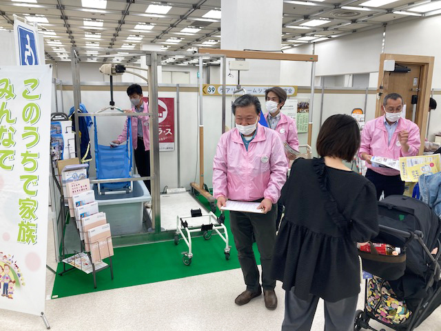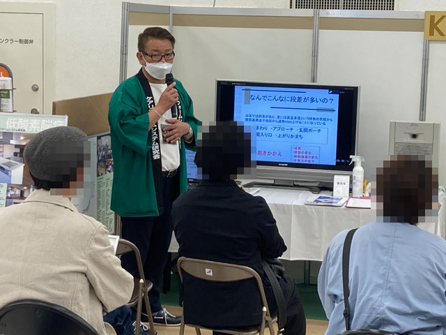 リフト・段差解消機・トイレ手摺・床材・洗面化粧台などを展示し、浴室・トイレ・外部からの進入のポイントなどについてもお話しいたしました。